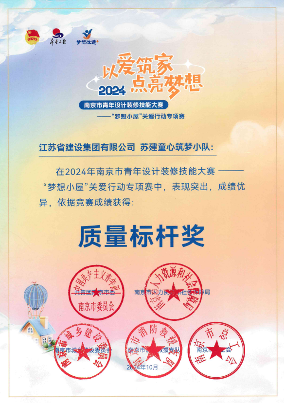 12月4日下午,共青团南京市委举办“圆梦青春”困境青少年关爱行动集中推介活动暨 2024年南京市青年设计装修技能大赛颁奖仪式,pa捕鱼网官网团委“苏建童心筑梦小队”荣获质量标杆奖。