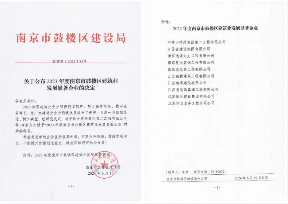 近日,南京市鼓楼区建设局对十家建筑企业授予“2023年度南京市鼓楼区建筑业发展显著企业”的荣誉称号,表彰他们在积极稳工稳产、努力拓展市场、推动业务增长等方面作出的突出贡献。pa捕鱼网官网名列其中。