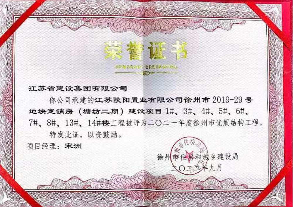 作为塘坊二期项目团队负责人,宋洲(31岁,一级建造师,工程师)自项目团队成立以来,一直尽职责守,履行岗位安全和工作职责,认真落实“安全第一、预防为主、综合治理”的安全生产方针。在他的带领下,塑造了一支作风硬、懂管理、专业强的青年团队,施工以来无任何安全事故发生。承建的塘坊二期2019-29号地块荣获徐州市优质结构工程等称号。